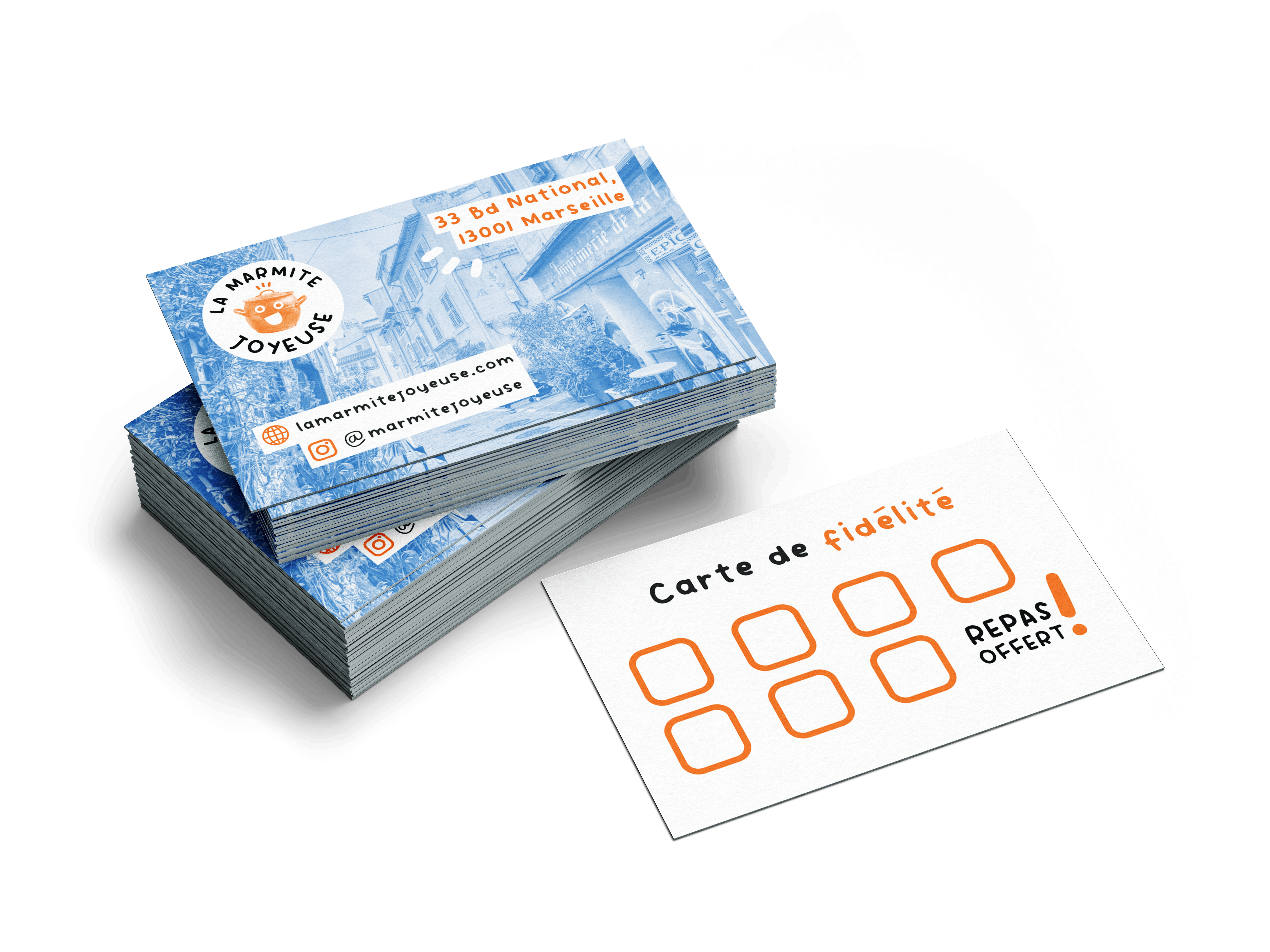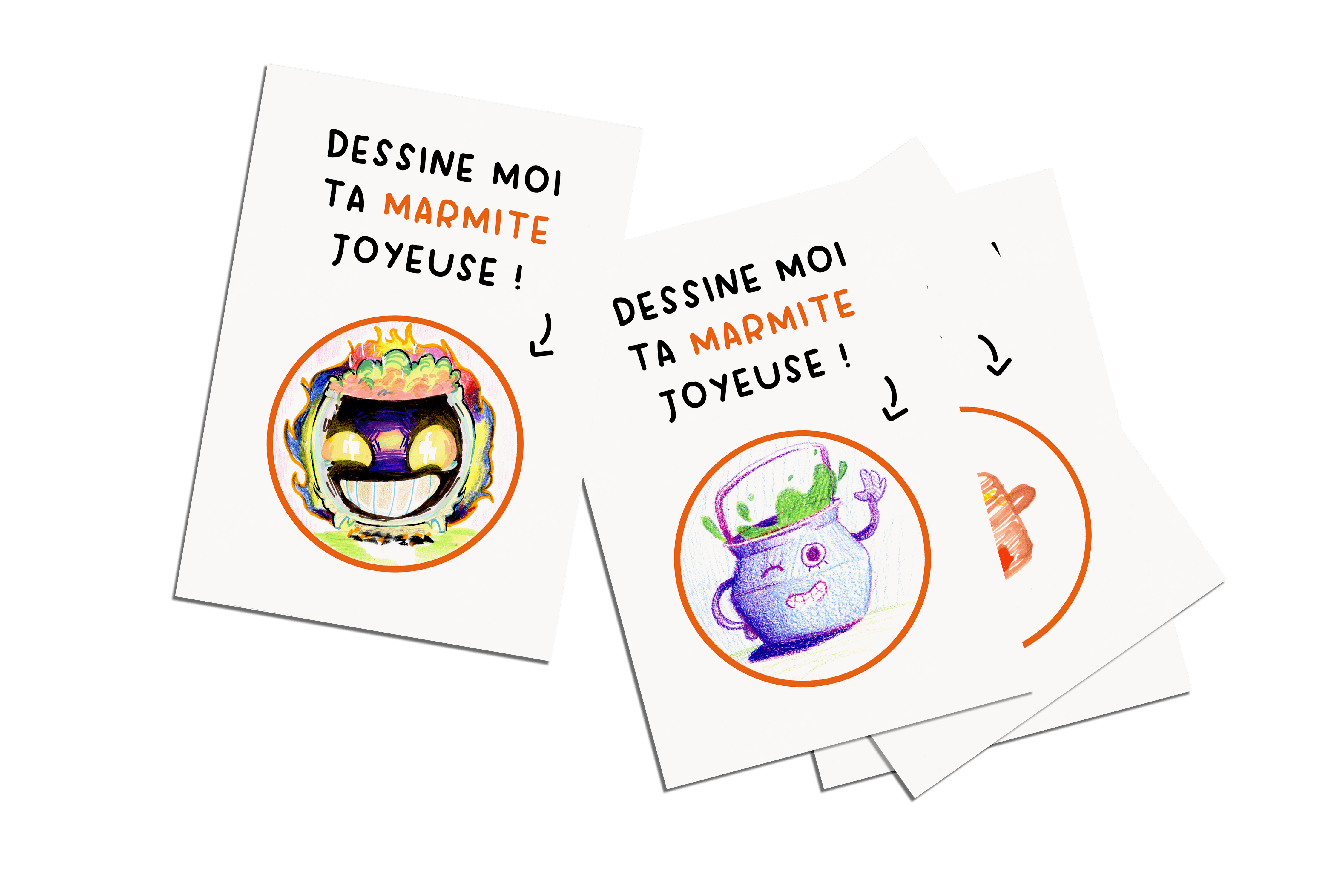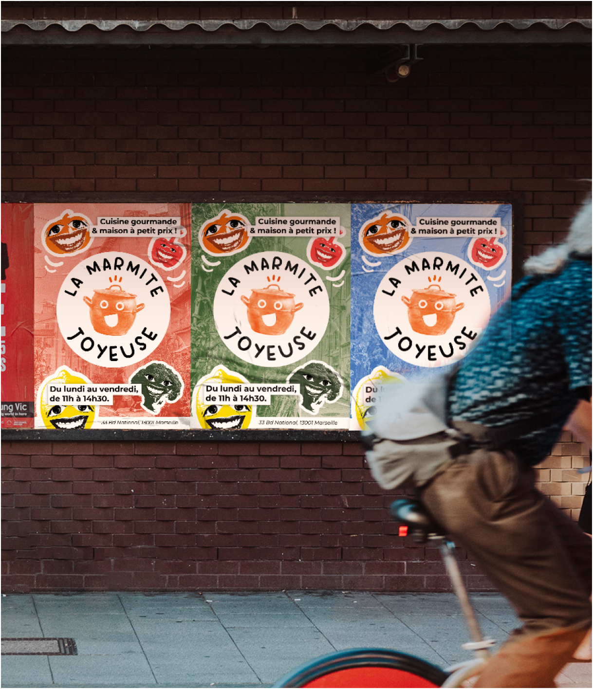 Pour la mise en situation et le déploiement, j’ai décliné l’identité sur une série d’affiches modulables, pensées pour l’affichage de rue et la vitrine, avec des variantes colorées qui gardent une lecture immédiate (promesse, horaires, adresse). La carte de visite devient un objet utile et durable, complétée par une carte de fidélité simple (tampons) pour encourager le retour. Enfin, j’ai créé un dispositif participatif “Dessine-moi ta Marmite Joyeuse !” : des cartes à compléter qui invitent les clients à s’approprier le symbole, générant des déclinaisons spontanées et renforçant le lien social.